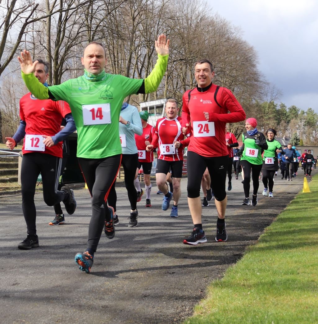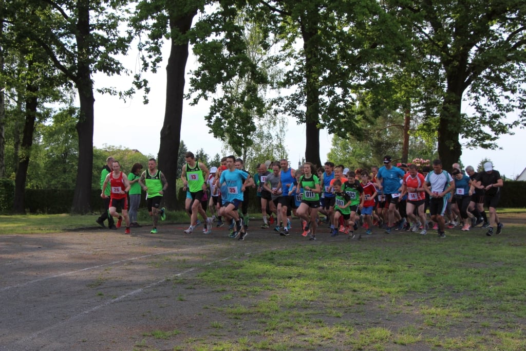 Nach dem Warm-Up bei Musik startete der Bürgermeister Jörg Rakete den Lauf. Erst ein Stück durchs Stadion und dann durch den Döberner Wald hinter der Stadtrandsiedlung.